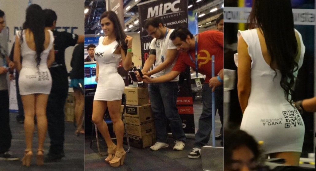 Hubo un caso muy particular que generó muchísima controversia dentro del campus, en las redes sociales y fuera del evento, se trata de una edecán que portaba un vestido muy entallado el cual tenía impreso un código QR en la parte de los glúteos, dicho código se debería de escanear para tener acceso a un registro y una dinámica, todo con fines publicitarios. Todo esto levantó un sin fin de comentarios y protestas tanto a favor como en contra, nosotros NO diremos nuestra postura ante este acontecimiento, sólo les dejamos las imágenes para que cada quien se forme su propia opinión.